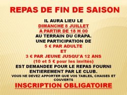 LE REPAS AURA LIEU AU TERRAIN LE DIMANCHE 8 JUILLET A PARTIR DE 18 HEURES APRES RANGEMENT DU TERRAIN SUITE AU CHAMPIONNAT DE LIGUE JEUNES.
